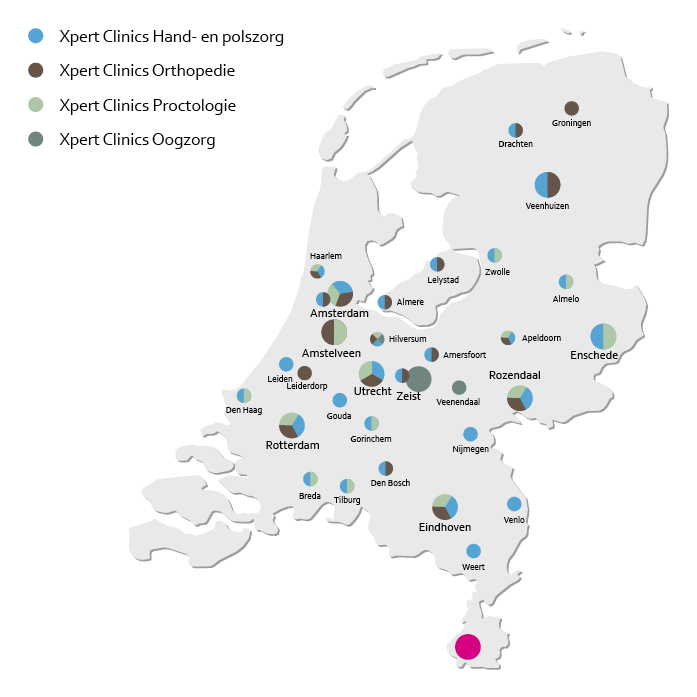 Xpert Clinics Proctologie heeft diverse hoofdvestigingen en poliklinieken. Op de poliklinieken vinden de consulten, diagnostiek, controles en kleinere ingrepen plaats. Op onze hoofdvestigingen vinden naast de consulten, diagnostiek, therapie en controles ook alle (grotere) operaties plaats. Bekijk hier onze vestigingen.